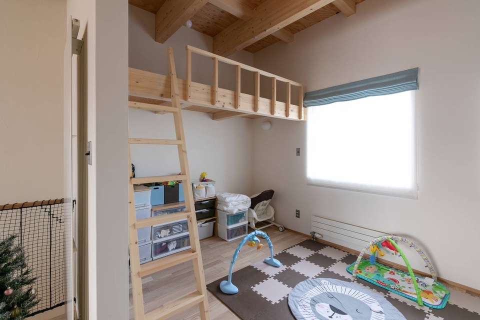 ダイニングの隣には子ども部屋を想定した個室があります。2階の床材は道産の楡(ニレ)を採用。節が少なく、粘りや強度が高い、年数を減ると少し飴色に変化する無垢材です。