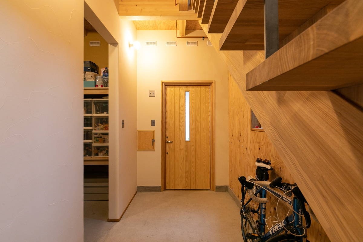 1階玄関ホール。広い土間には自転車も置けます。室内の大半は白色の塗り壁ですが、片側の壁だけ、自転車をたてかけても汚れなどが気にならず、フックも付けられるように合板を施工。