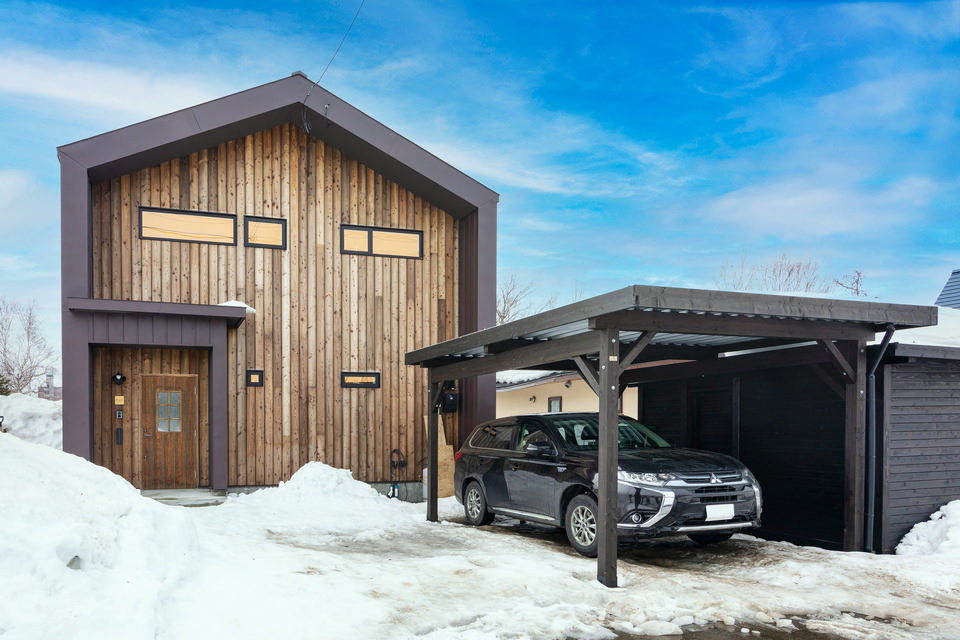 道南杉の板張りがナチュラルな表情を見せるTさん邸。板張りの外壁には、天然成分からつくられたウッドロングエコを塗装しています。できるとことは自分たちでやりたいとTさんファミリーは、DIYで1本ずつ塗装を行いました。