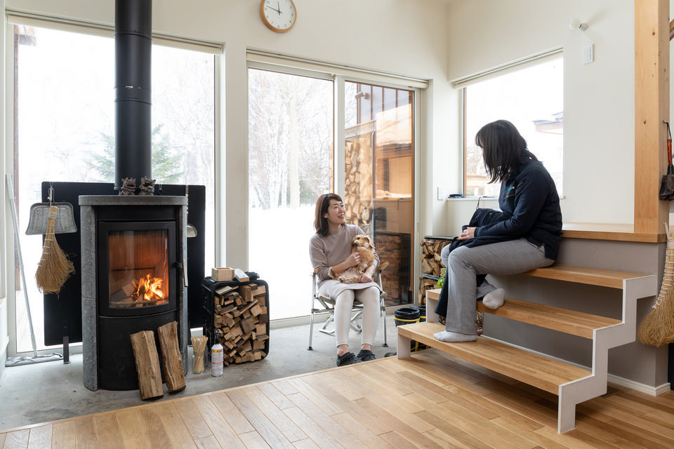 リビングの南側は薪ストーブのある土間。大きな窓からは、公園の白樺並木が眺められ、庭の菜園にも出られます。「薪ストーブと窓の木々を眺めているだけでもまったく飽きませんね」と、愛犬を抱っこしながら奥さまは話します。右に腰掛けているのは、設計を担当した可香(かが)さんです。