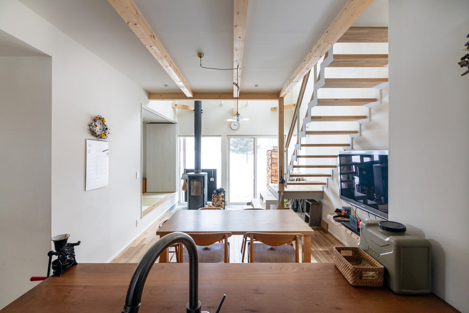 白い塗り壁、そして木の質感にあふれた13.5畳のLDK。フローリングはナラの無垢材で、こちらもTさんたちが塗装に参加しています。オープン階段の踊り場は椅子かわりに使うことも想定しています。