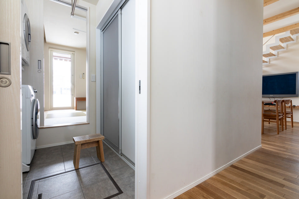 洗濯動線を効率化するため、ユーティリティ~和室~ウッドデッキは一直線に並べて配置しました。