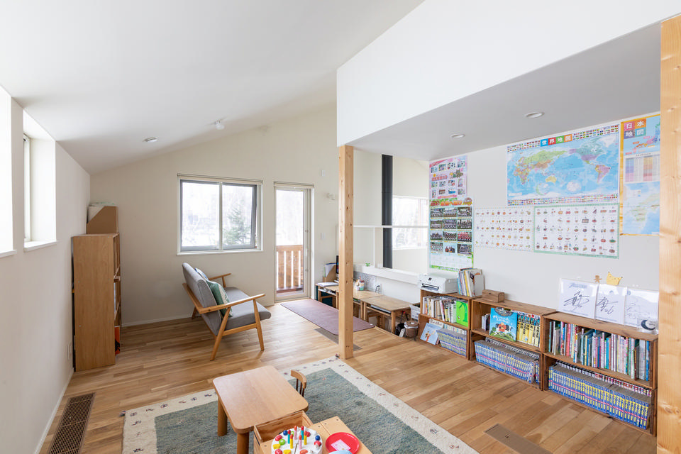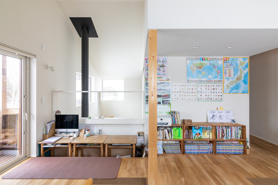 2階のフリースペースには、掘りごたつのように足を入れられるデスクスペースを設けました。机は、それまで住んでいた帯広の小学校で不要になったものを引き取って活用。隣に並んだ本棚も、リンゴやワインを入れていた木製の箱を塗装して使っています。
