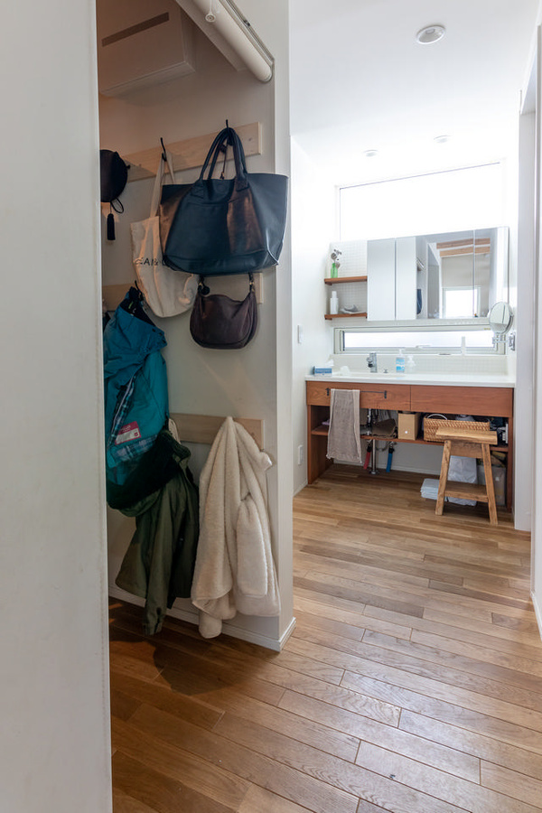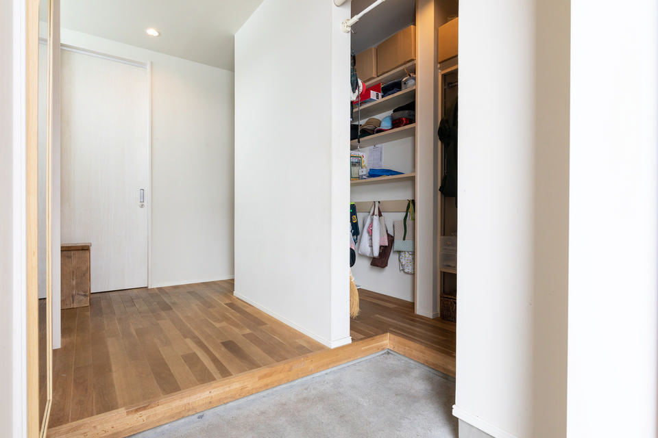 収納は家族に必要な分だけ、必要なところにつくりたいと考えていたTさんご夫妻。玄関にはシューズクロークを設けました。ランドセルや上着などもこのクロークに置いて、お子さんたちが利用しやすいようにしています。
