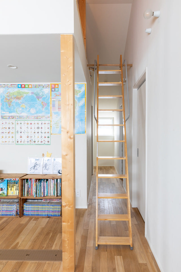 ロフト階段を引き出せば、三角屋根を利用した屋根裏に上れます。ひな人形などの収納に使っていますが、子どもがブロックで遊ぶ絶好の秘密基地にもなっているとか。