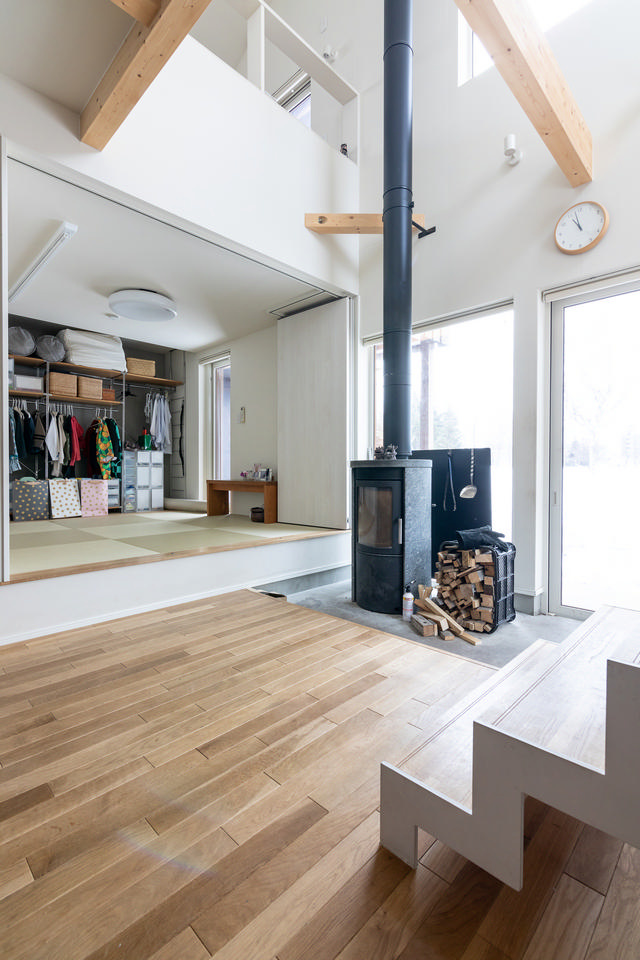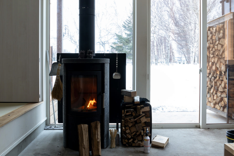 薪ストーブは、デンマーク製のHeta(ヒタ)。蓄熱性の高いソープストーンで覆われていて、火を消してもじんわりと室内を温めてくれます。Tさん邸には床下暖房も設置していますが、この冬はほとんど薪ストーブだけで済んだそう。「毎日の火付けにも慣れてきて、楽しいですよ」と、ご夫妻の夢だった薪ストーブの暮らしを満喫されています。