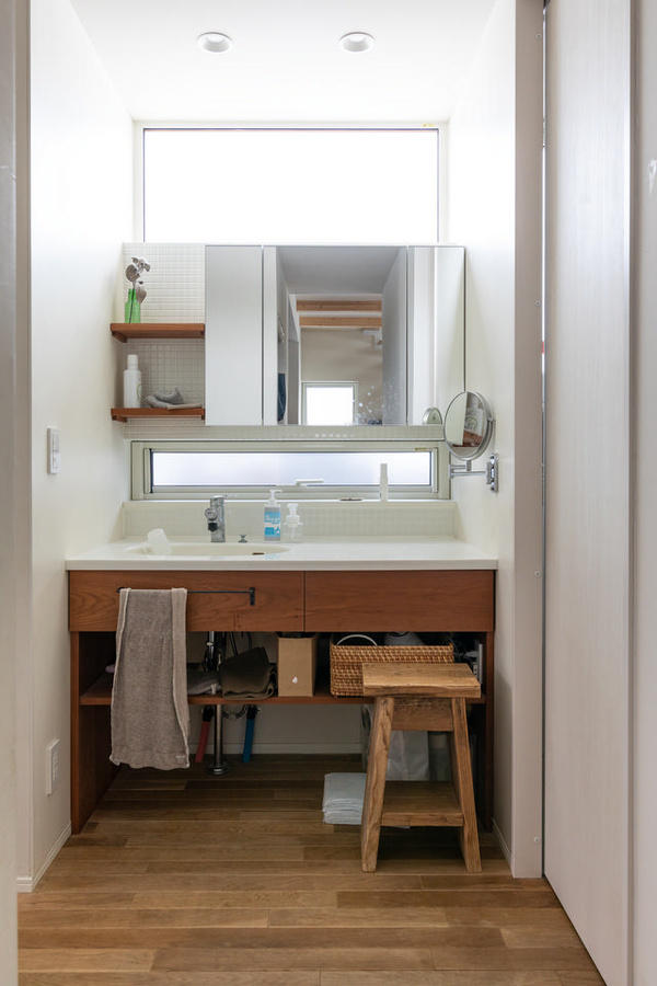 玄関ホールに設けた洗面台も、旅する木さんと辻野建設工業さんによるコラボレーションです。奥さまの希望で洗面台の幅は2人が並んで使えるように、収納付きミラーの上下には、なるべく自然光でメイクができるように窓を付けました。