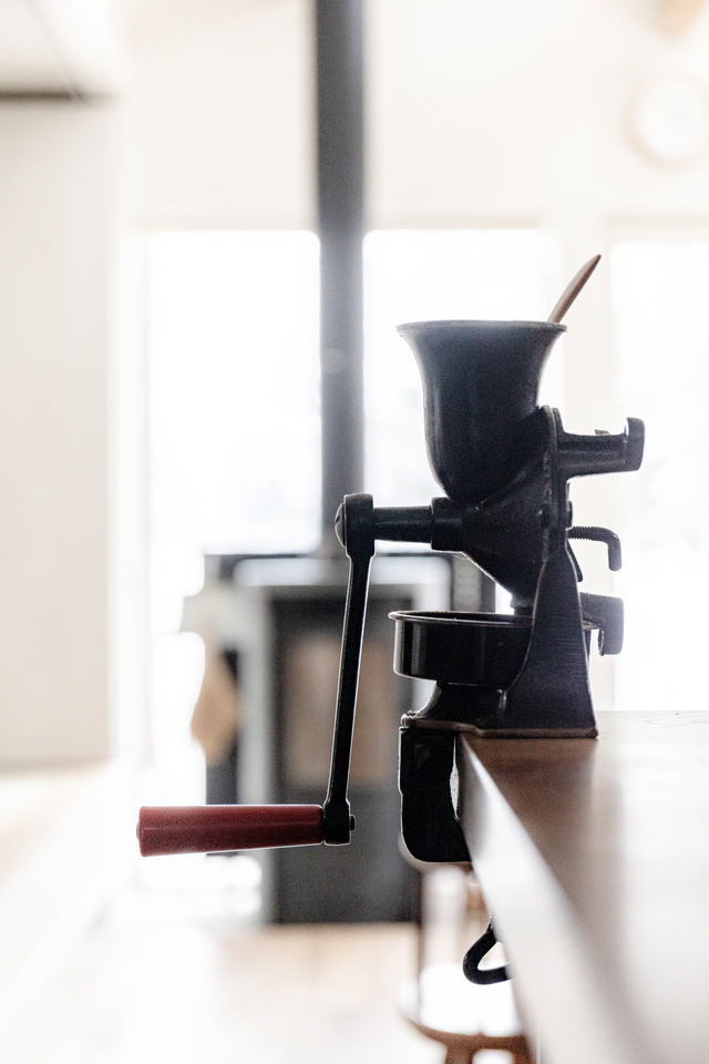 メインのキッチンカウンターはシンクを、壁側のカウンターにはコンロを付けたセパレートタイプ。旅する木で棚も造作しています。普段からパンはグリルで焼き、ご飯はお鍋で炊くため、家電製品はほとんどありません。カウンターのわきには、外気導入式の大型食料庫(パントリー)を備えました。