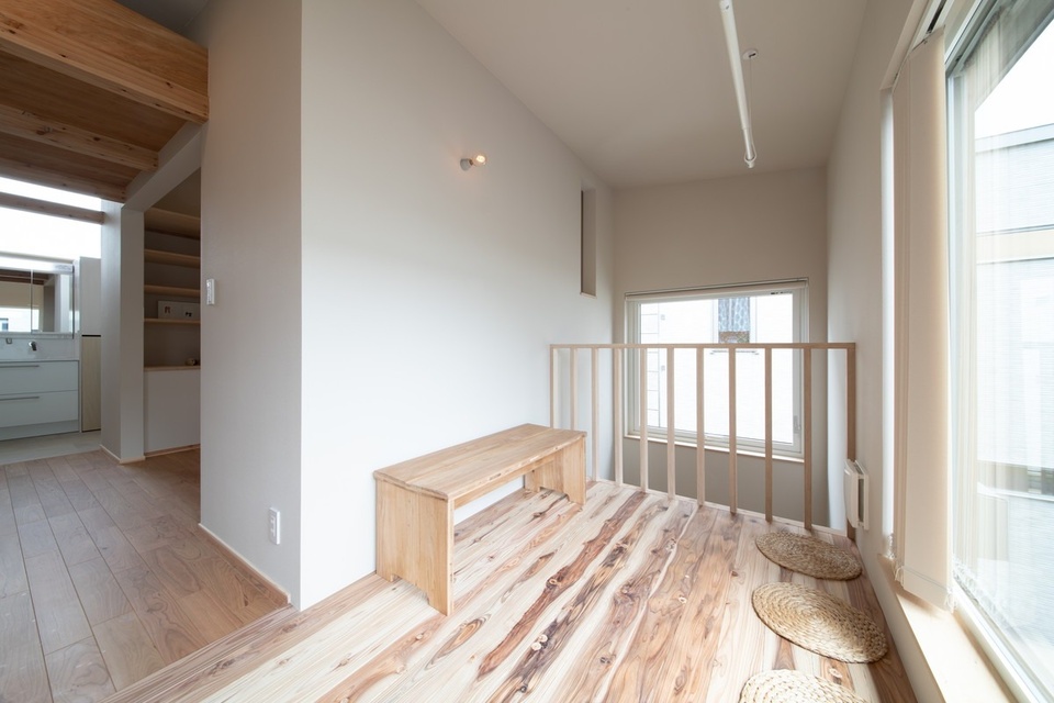 吹抜のさらし階段を上がった場所は物干しスペースになりました。篠崎正子さん「足裏に心地よい杉の無垢板を敷いてデッキをイメージしています。ベンチも置きました」。2階はトイレや浴室以外はドアの無いオープン設計です。