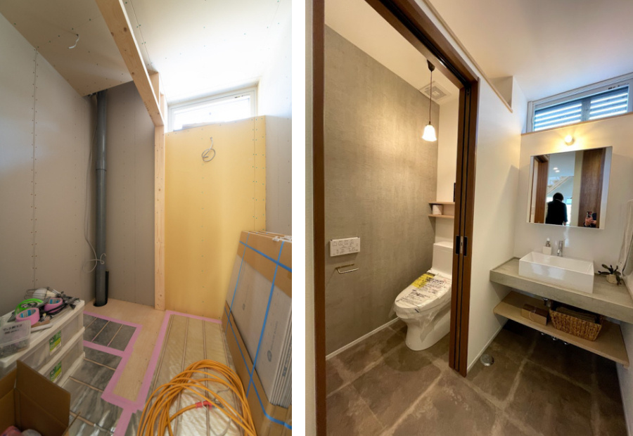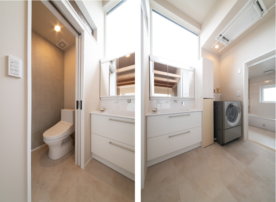 1階トイレと洗面化粧室。地下からつながる「風道(ダクト)」は、トイレの背面に収まりました。