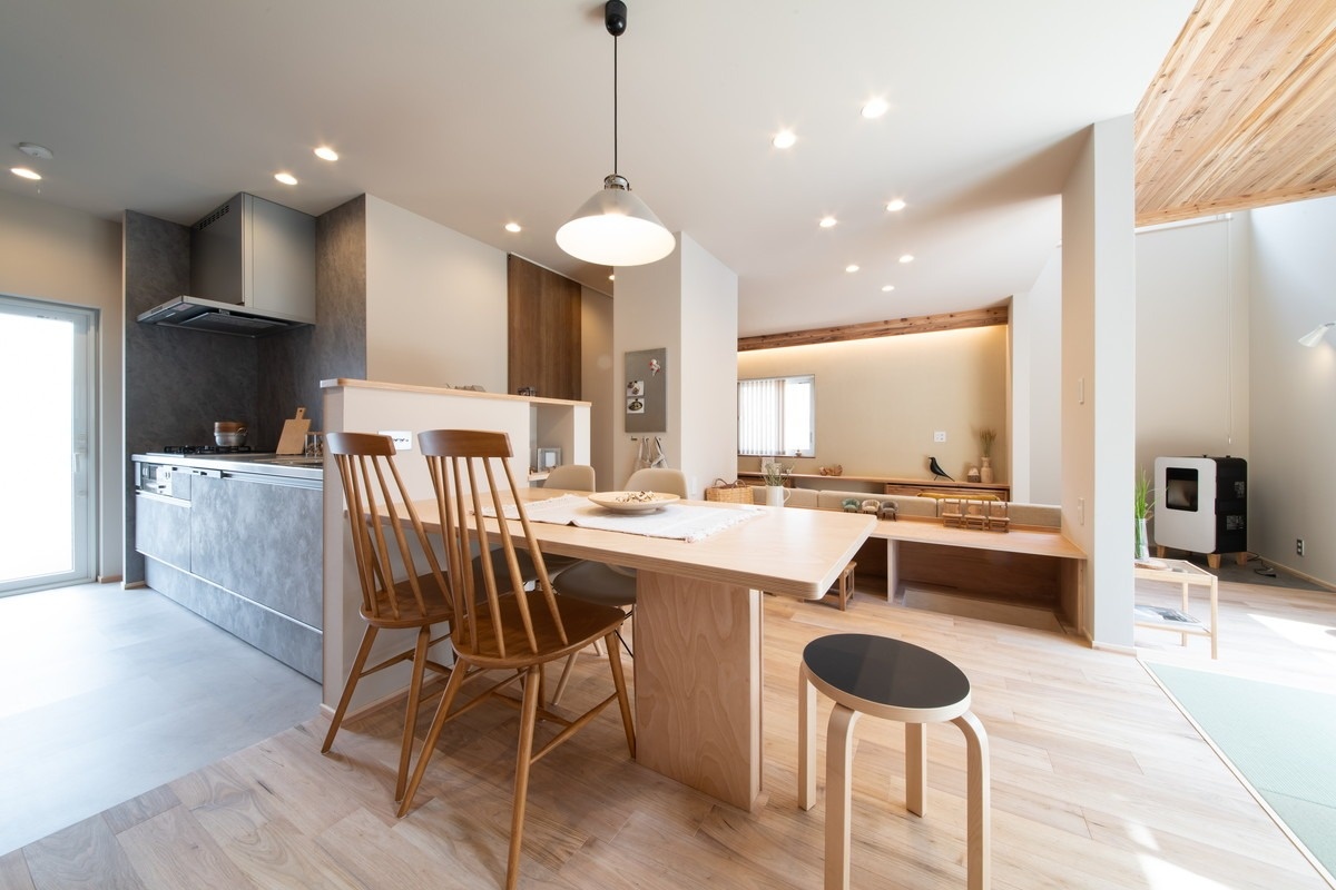 ダイニングはキッチンからの動線が良い横並びの配置。クルミの三層材を使ったダイニングテーブルは造作のオリジナルです。