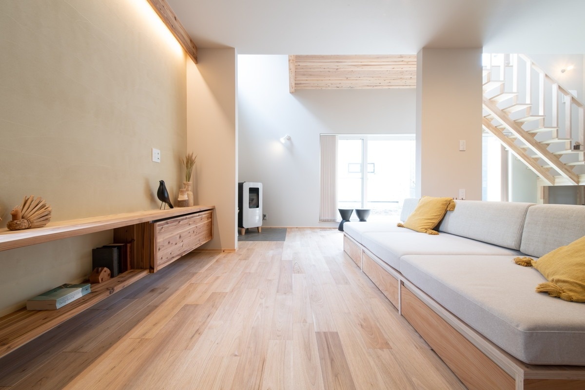玄関ホールを抜けると、目前にリビングが広がっています。左手には稚内産珪藻土を使った塗壁仕上げの壁が続き、間接照明や造作のテレビボードも備えています。