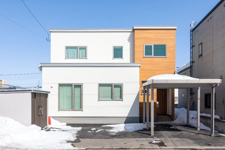 雪対策としてアプローチを覆うようにカーポートを設置し、隣に2台分の駐車場を確保。そのため「建物に使えるスペースが敷地の半分程度に限られていた」とご主人はいいます。「子供が暮らしやすく、室内が広く見える家にしたいという希望が第一にありましたが、間取りに制約のあるハウスメーカーでは難しいと感じていました」。