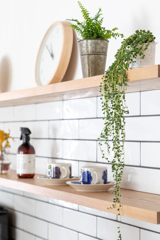 キッチンの背面にはロータイプのカップボードを設置。その上に飾り棚を造り付けました。白のサブウェイタイルをあしらって上品な雰囲気に。
