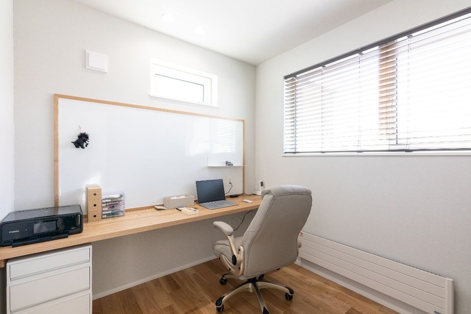 南向きの窓がある約3.5帖の書斎。正面に長さ2m40cmほどのカウンターと書類などを留めるホーローパネルを取り付けた機能的な空間です。