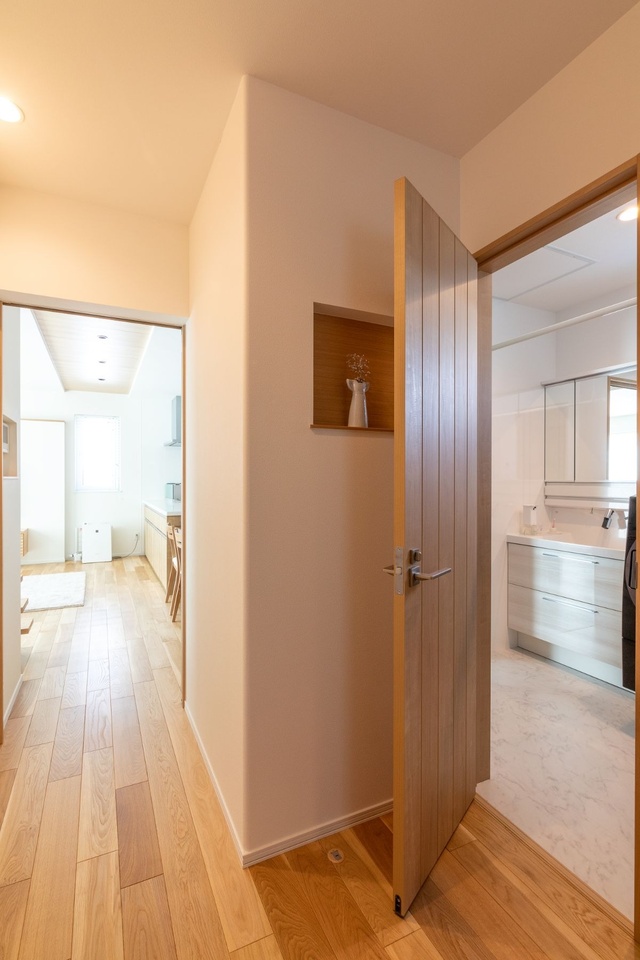ニッチと建具に木を使った暖かみのある玄関ホール。リビングの端まで続く真っ直ぐな動線上には障害物が何もありません。
