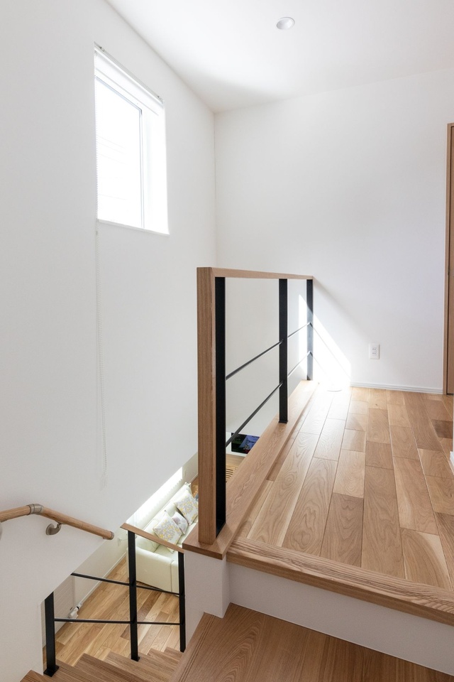 黒のアイアンと木を組み合わせた開放的な透かし階段。圧迫感がなく、お部屋も広く見えます。「キッチンから見た時、視線が通るデザインにしました(ご主人)」。