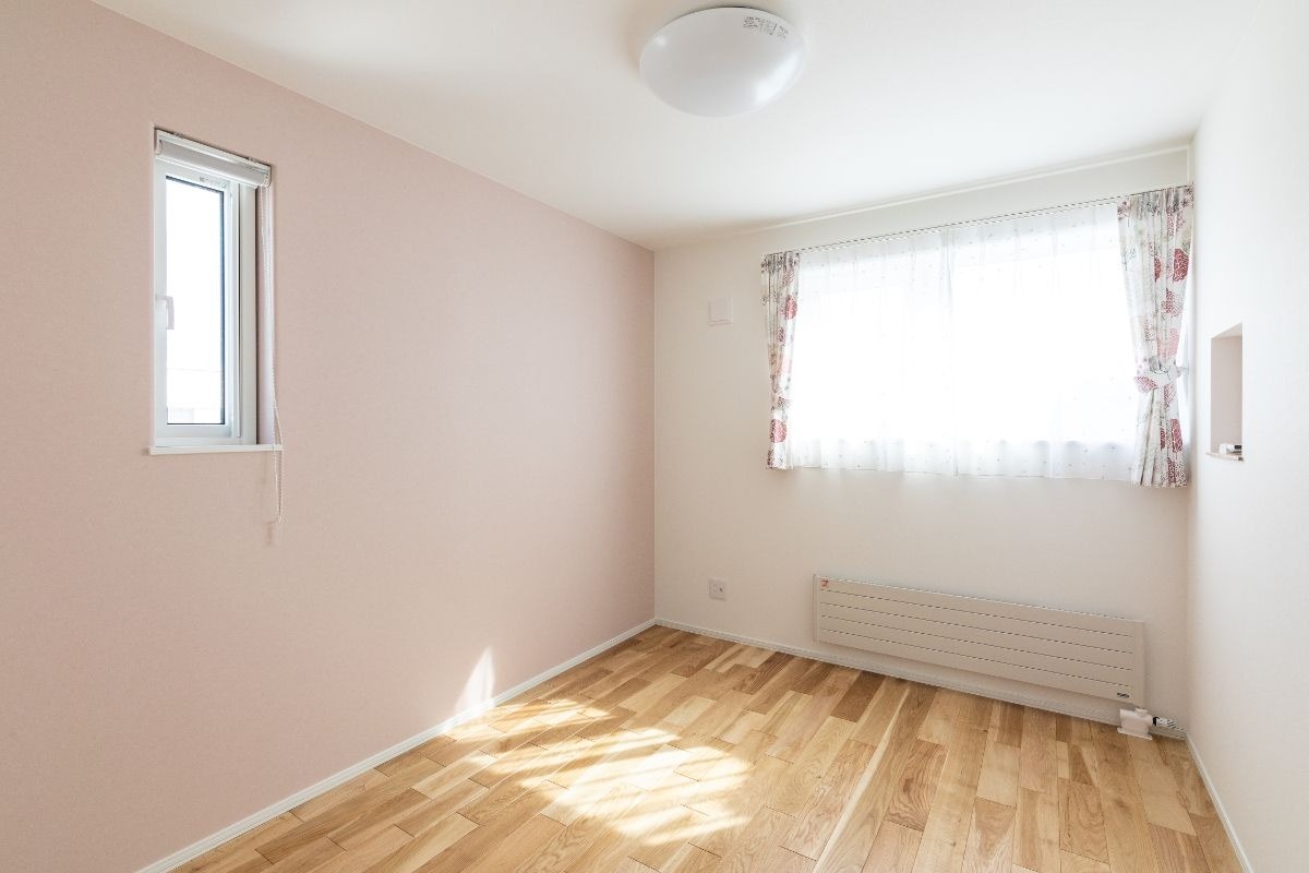 ピンクのアクセントクロスと花柄のカーテンが可愛い子供部屋。子供っぽくなりすぎない色使いなのでNちゃんがお年頃になってもお洒落に住みこなせそう。