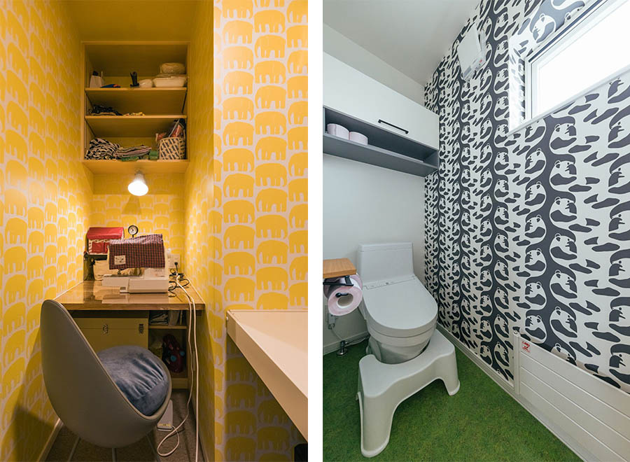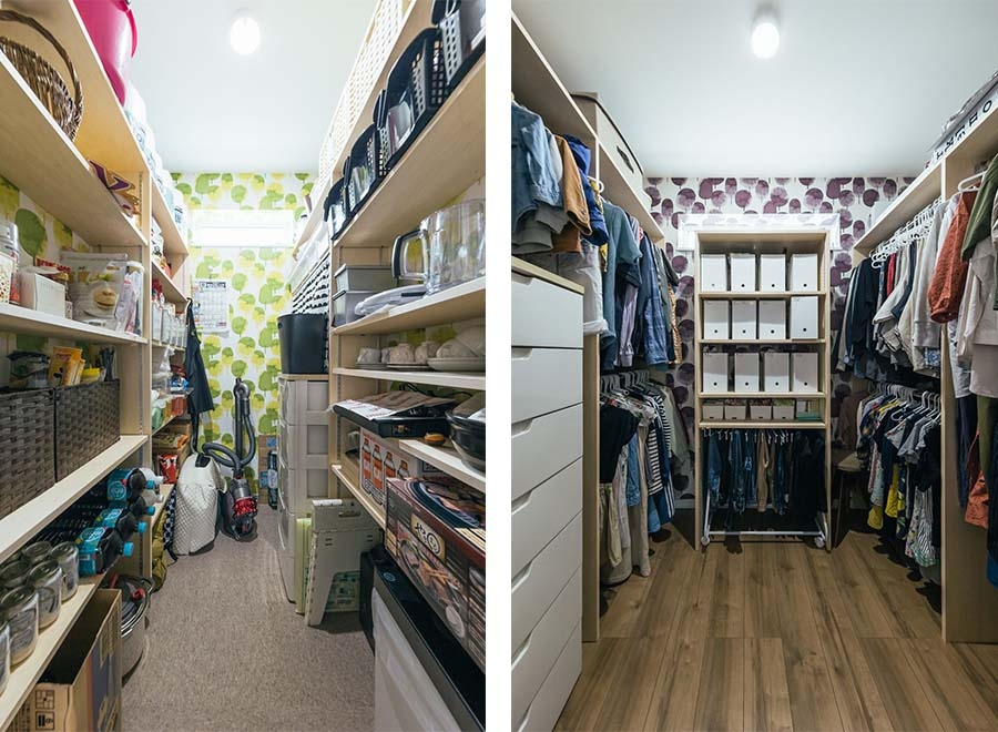 明るいパントリー(写真左)と落ち着いた雰囲気のファミリークローゼット(写真右)。「インターネットでダウンロードした壁紙見本を、紙で作った模型に貼って印象を確かめました」(奥様)と、万全なイメージ作りを行ったおかげで思い通りの仕上がりになりました。