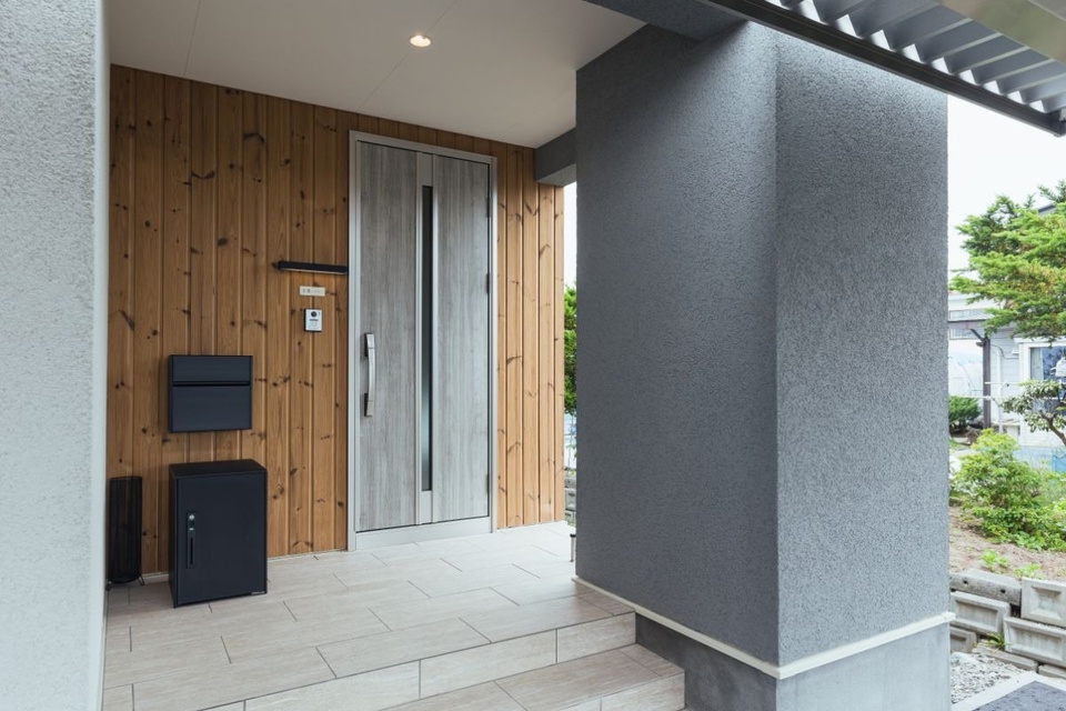 4種の素材を組み合わせた外壁。玄関部分にはレッドパインを使用しました。