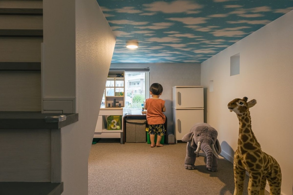 リビングと「扉」ではなく「段差」で区切られたキッズスペース。空間を共有しつつも境界がはっきりとしているのでおもちゃがリビングに散らからず、子ども達も思い切り遊べるのだそうです。