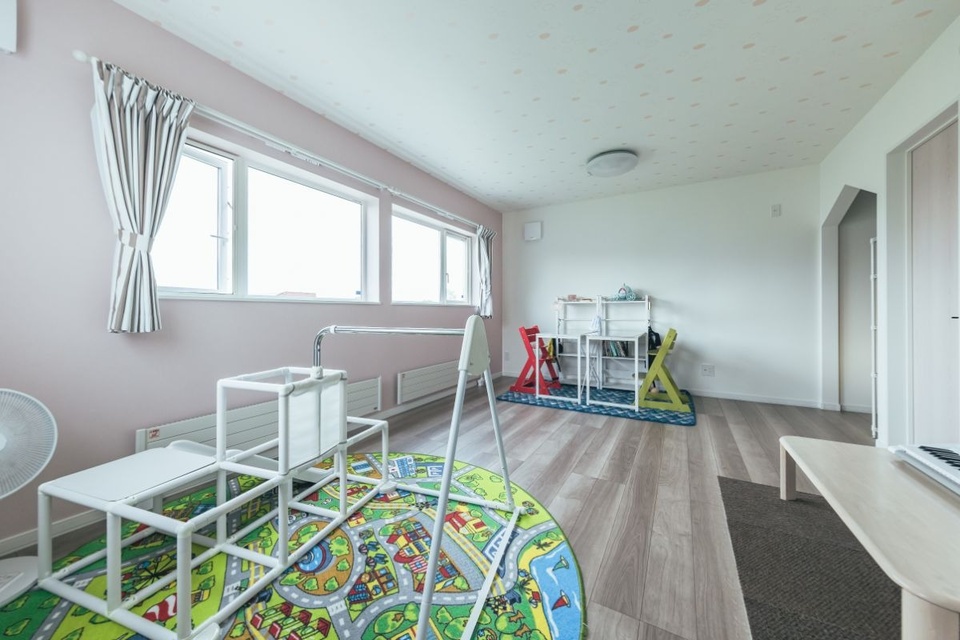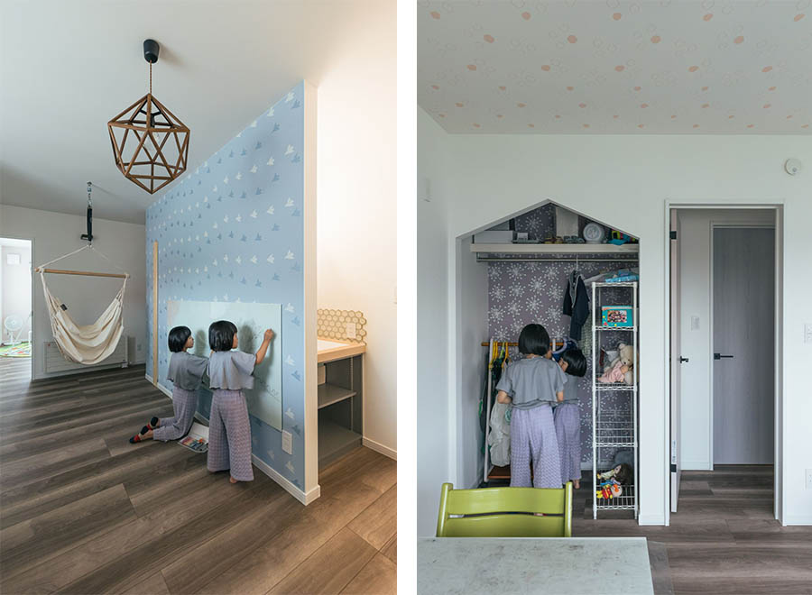 アクセントクロスを多様し、部屋ごとに違った雰囲気を楽しめるのもS邸の大きな魅力です。二階ホールの壁面には絵を描けるボードも設置、家族のお気に入りの場所になっています。