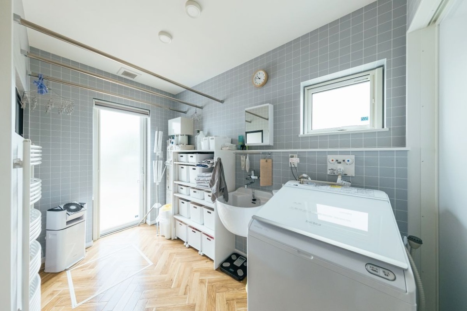 「この家は洗濯機から乾燥室、そして外の物干しスペースまでが一直線。ファミリークローゼットも二階ではなく、洗濯動線上に作ったので移動が苦でなく、家事が楽しくなりました」(奥様)。クローゼットの位置も重要なポイントのようです。