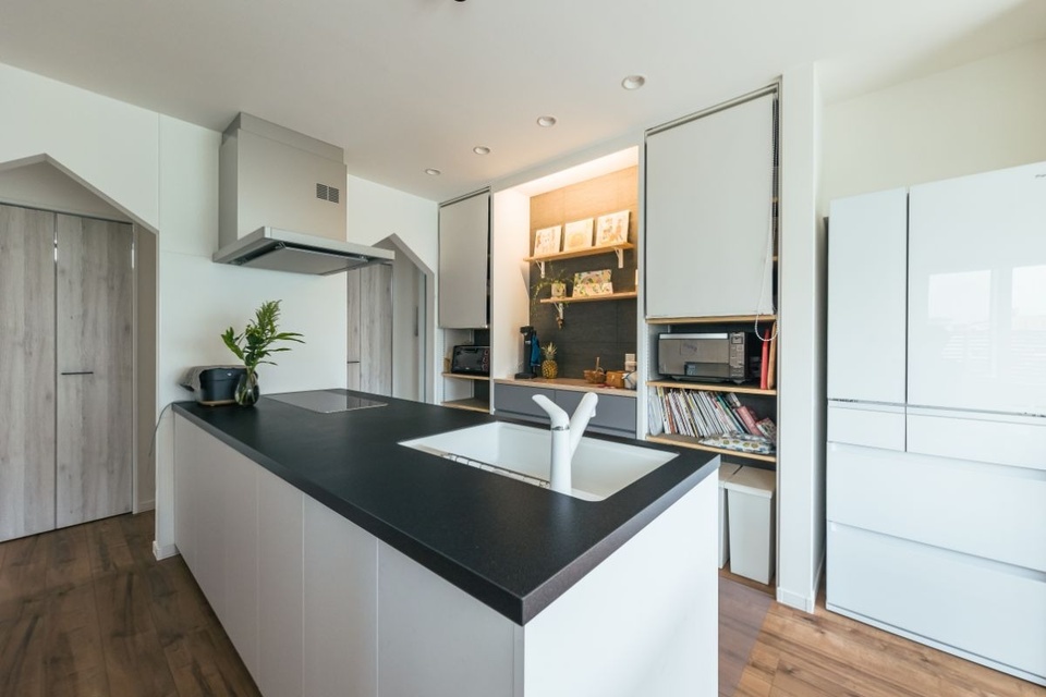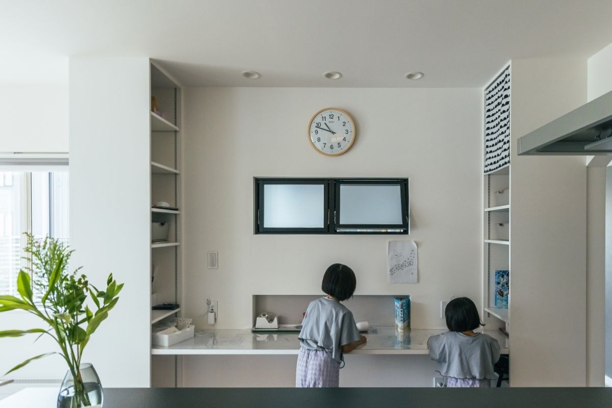 お子さんたちは、お母さんの近くで勉強したいのでダイニングで勉強するご家庭も多いと思います。すると、夕食時に綺麗に片付けをしないと食事ができない・・・。そこで、S邸では、キッチン前に専用のカウンターを設けました。