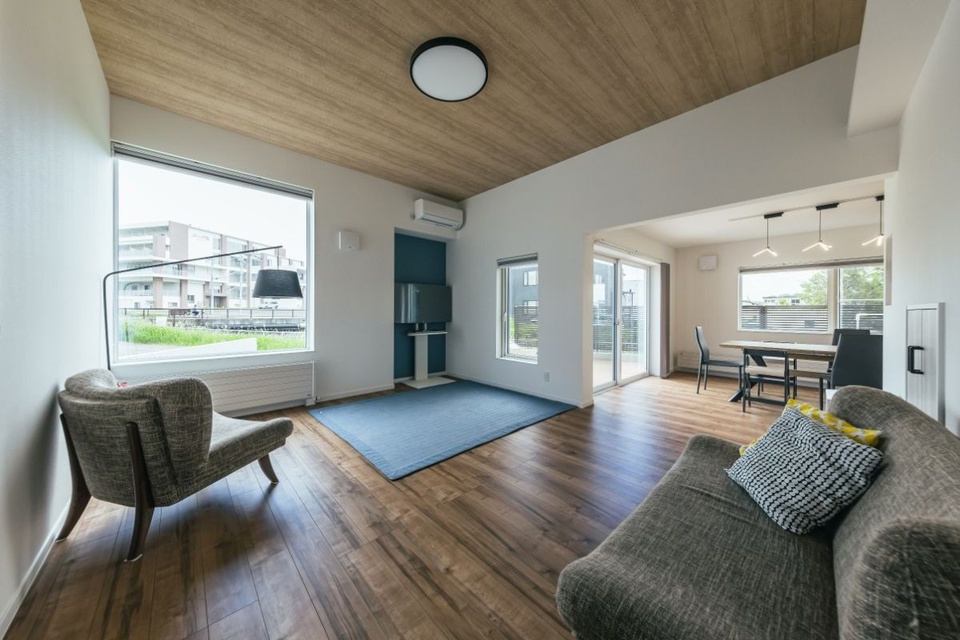外観は「段差や窓の位置の工夫、素材の切り替えなどによって表情が出るようにしています」(古市専務)と型にはまらないよう計算されたデザイン。フレームが薄く、スタイリッシュな印象を与えるFIX窓が印象的です。