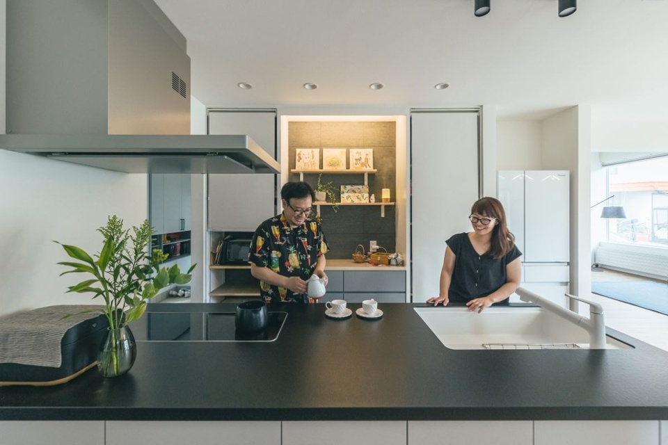 キッチンは調理スペースに余裕があり、二人向かい合って作業できる形。元々料理好きだったというご主人も、「このキッチンになってからますます料理することが多くなりました」と笑顔です。