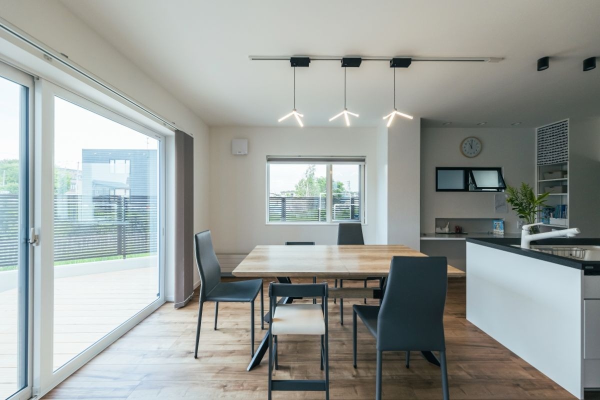 ダイニングはリビングとつながりつつも、完全にオープンではない配置に。テレビが見えない位置なので、食事中の家族は落ち着いて、食事を終えた家族は気兼ねなく過ごせます。
