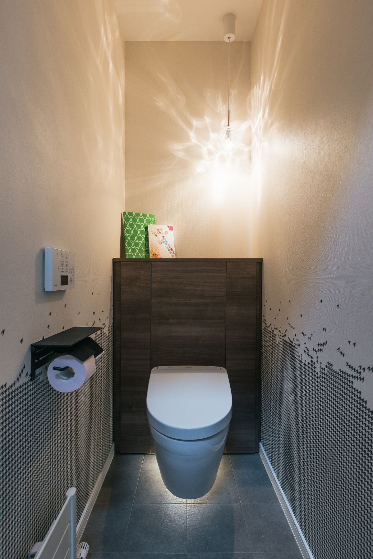 モダンなライティングがお洒落なトイレ。浮かんでいるように見える便座はTOTO製です。タンクが背面に収納され、タンクレストイレのように室内がすっきりとして見えます。美しさだけでなく床を清潔に保てる点も考慮して選びました。