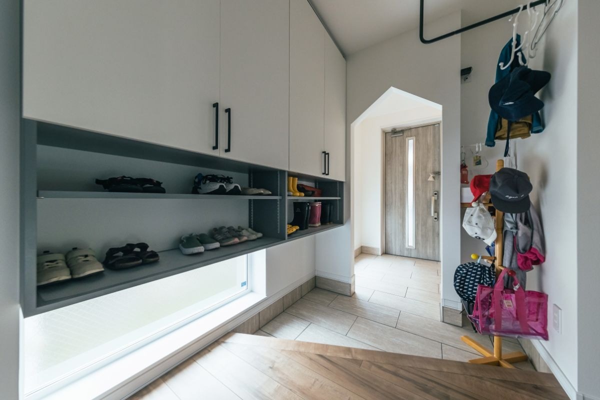 「お客様を気持ちよくお迎えできる”エントランス” を作りたかった」と、玄関はホールがふたつある造りにしました。家族用玄関(写真右側)はあえて扉やカーテンで仕切らず、生活感を隠しつつも奥行きを感じさせる空間使いです。