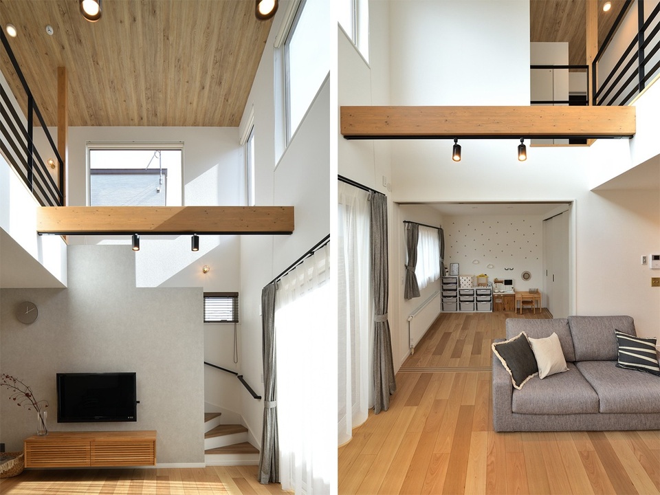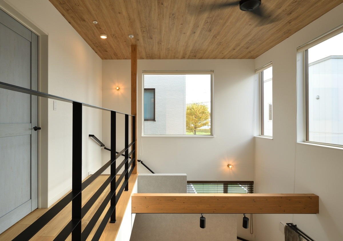 吹抜けに面した開放的な2階ホール。天井に貼った木目調のクロスや木の梁も良い雰囲気です。