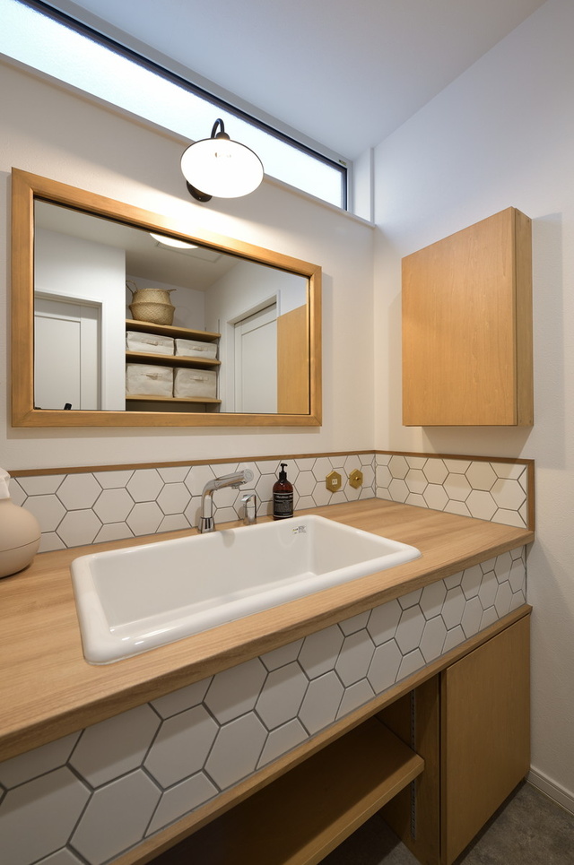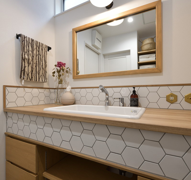 3つ目は造作の洗面台。自宅ではハニカム型のタイルを使い、スイッチパネルもハニカムにするなど、こだわった空間です。ハニカム柄はダイニング・キッチンの床タイルにも使っていて、リンクコーデを楽しんでいます。