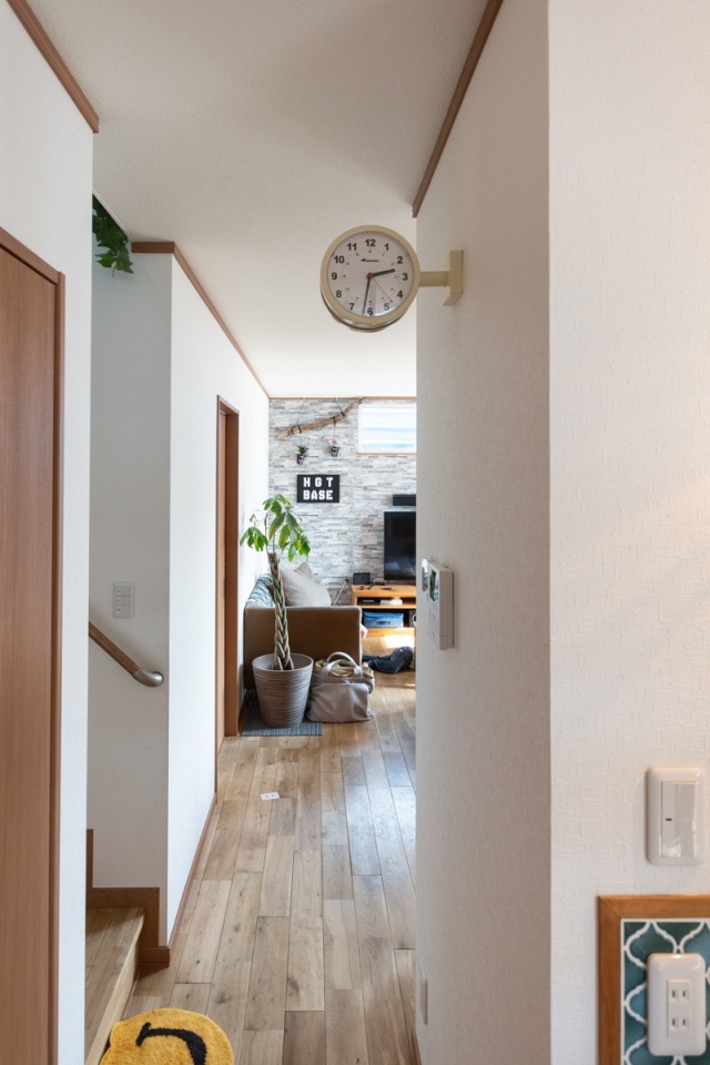 教室が開かれていたキッチン&ダイニングと、家族が過ごすリビングはこの通路で行き来できます。扉はありませんが、視界や音を若干でも隔てる工夫です。園田先生は教室をしている最中でも、お子さんの様子を気に掛けることができます。