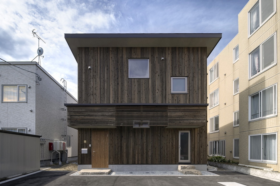 石狩市のF邸。外装には無害で再塗装の要らないウッドロングエコにどぶ漬け塗装した屋久島地杉を使っています。こちらの面は北向きになっていて、2階には一日中安定した照度を保てる大きな採光窓を配置しました。広い駐車スペースの右手前に見える蓋は融雪槽です。