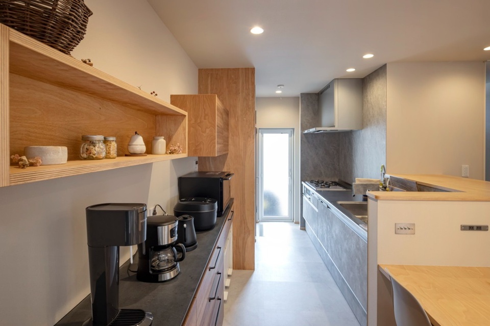 スタイリッシュなキッチン。奥に見える開口部は、建物正面に出られる勝手口です。取材したのは8月中旬。外気温は28度ほどでした。