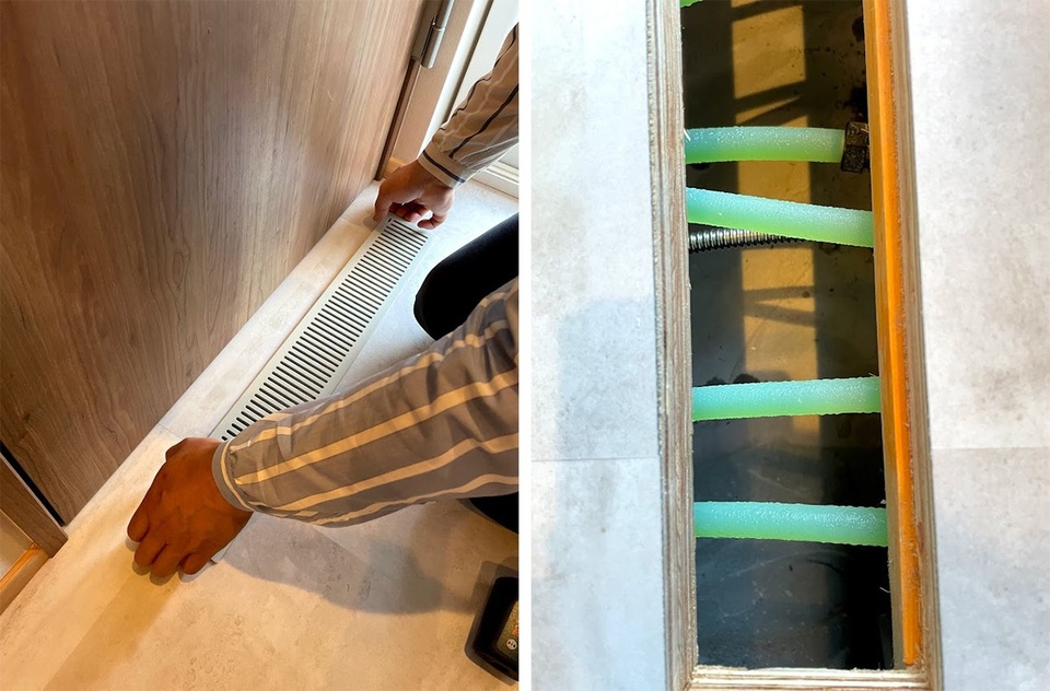 勝手口の手前にある床ガラリを外して、篠崎社長が中を見せてくれました。架橋ポリエチレン管が見え、ひんやりとした冷気が感じられます。