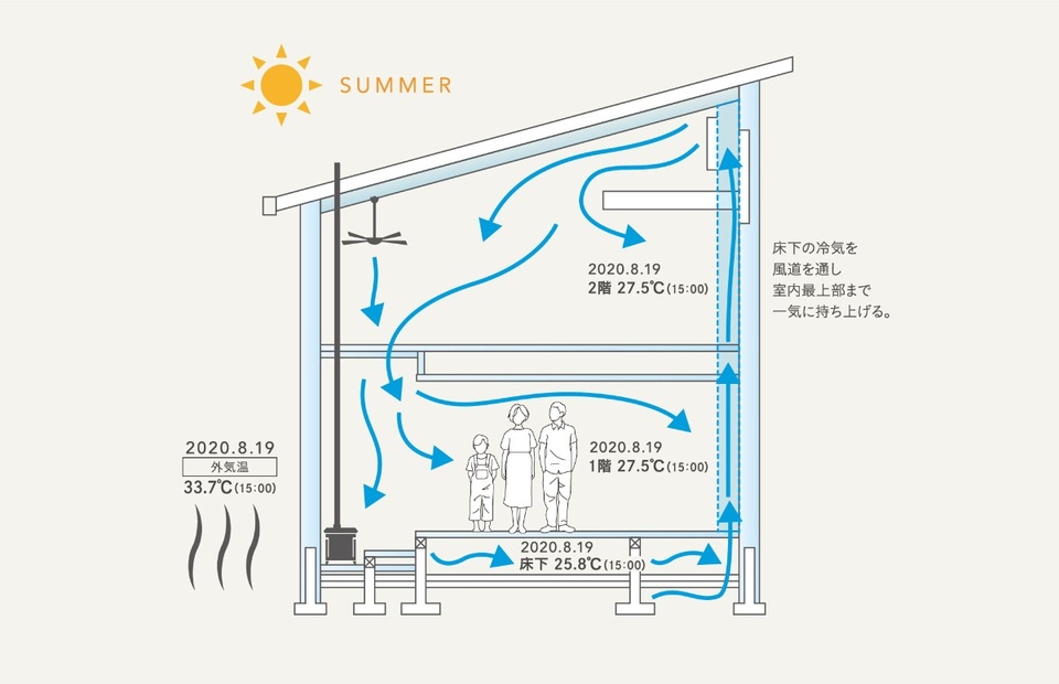 この冷気が風道を通じて2階屋根裏まで押し上げられ、2階の上部から室内全体に広がります。これがラディアント・サーキュレーションを活用した涼房システムの仕組みです。