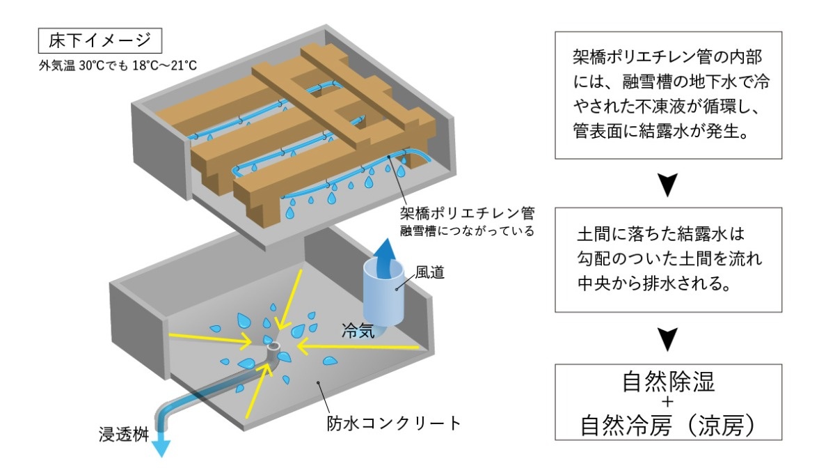 結露水は水滴となって傾斜をつけた防水コンクリート土間に落下します。集まった水は中央の排水口から外の浸透桝に流れ出ます。架橋ポリエチレン管を流れる不凍液は、建物床下と融雪槽を循環することで、常に冷たい温度を保ちます。こうして床下は、涼しい温度と、適度な湿度を保ち続けることができるのです。(図1下部イラスト)