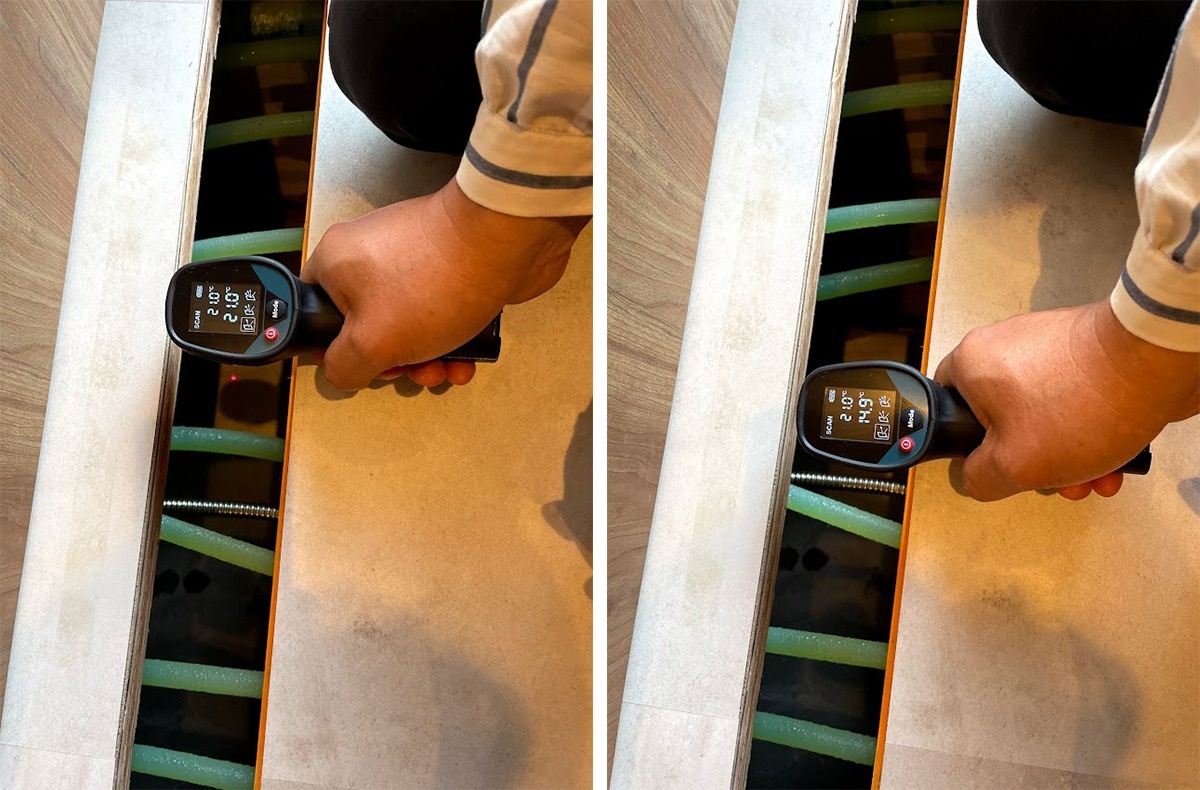 タイルを貼ったキッチンの床表面温度は23.4度でした。床ガラリは開閉式になっているので、隙間の大きさを調整して、室温温度調節が可能です。