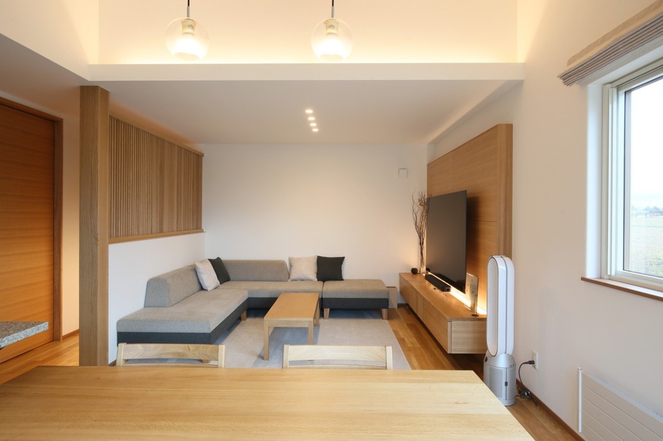 リビングに馴染むソファは、昭和木材から家具材を仕入れる旭川家具メーカー「宮田産業」製。間接照明やダウンライトでグッと居心地の良さが増しています。