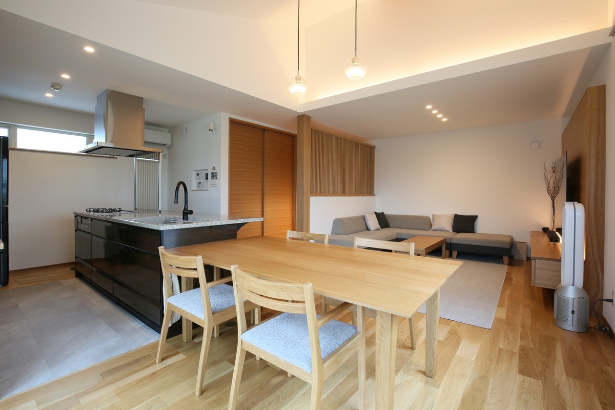 LDKに続く扉の先に広がるのは、訪れる人が驚くような非日常の風景です。タモ材の縦格子や、陰影が美しい間接照明は和風旅館のような佇まい。そして、目の先に飛び込んでくるのはスタイリッシュなキッチンです。生活感をなくしたいというご夫婦の希望が、大胆な設計に反映されています。