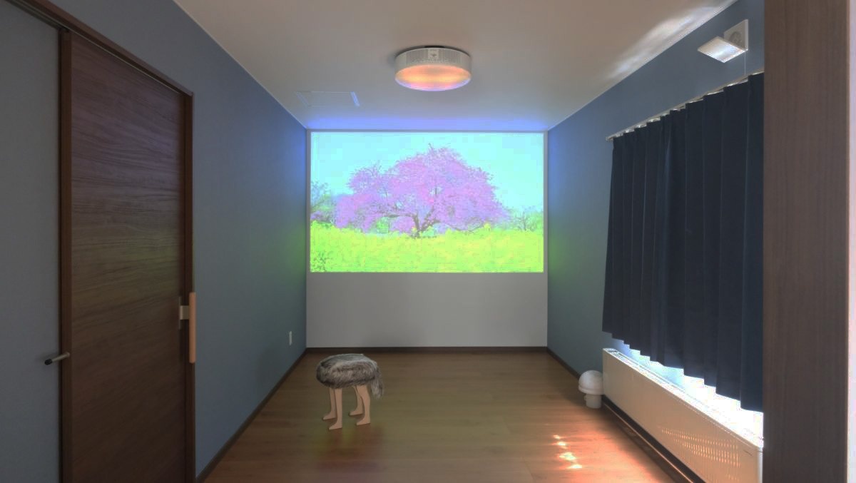 遮光カーテンを閉めれば、シアタールームに早変わり。「仕事後は、映画や焚火の動画などを見て癒されています」とKさん。