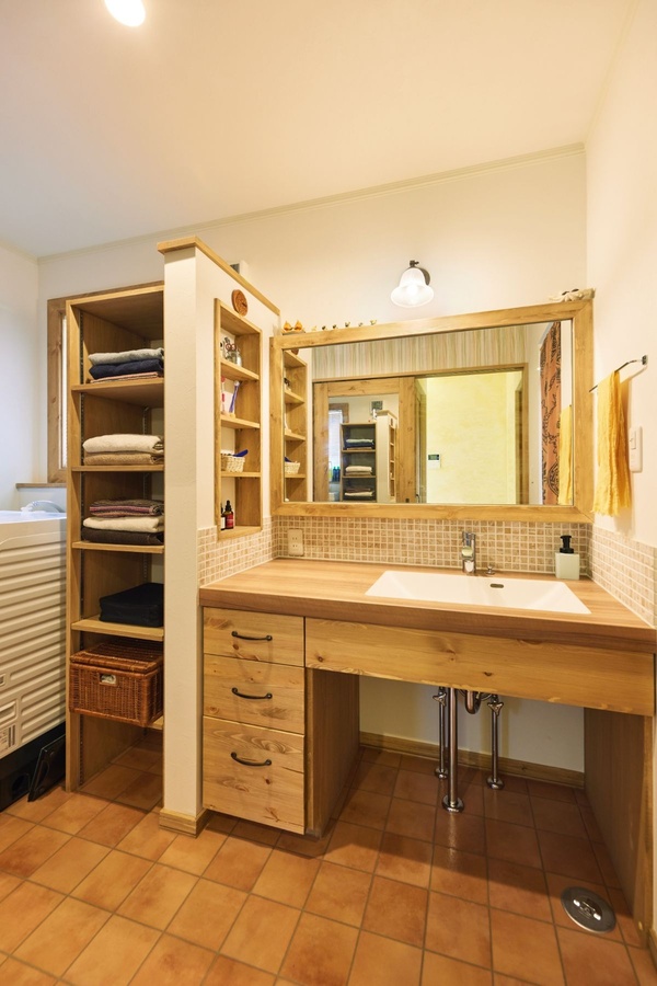 家族用スペースの造りは何度も生活をシミュレーションしてデザインしました。造作の洗面台は奥様がお化粧をするのにちょうどいいよう、鏡をせり出した形で設置。「ちょっとの差ですが、使いやすさが全然違うんです」(奥様)