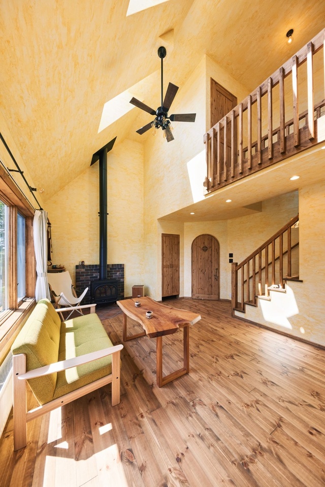 訪れた方に「(非日常の)世界に入ってほしい」とコンセントや空調の位置を工夫、生活感を排したLDK。印象的な塗り壁はローラーで色をつけてから拭き取った、ムラのある仕上げです。
