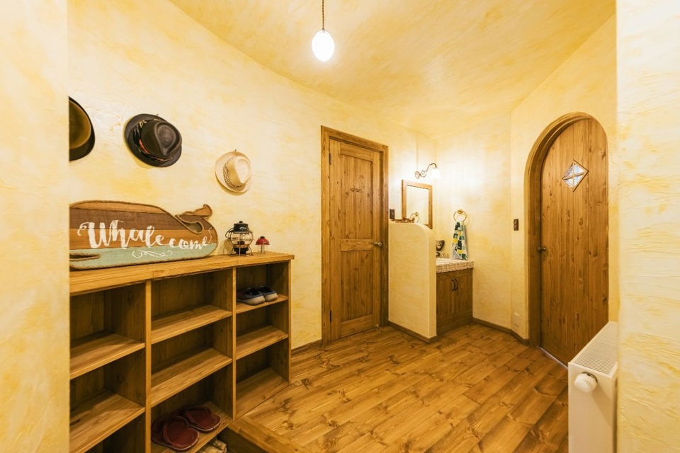 やわらかな曲線を描く壁とアーチ型の扉が目を引く玄関。こちらの玄関とトイレ、LDKは食事や宿泊のお客さんも利用するスペースと共有です。細部まで雰囲気づくりに力を入れました。