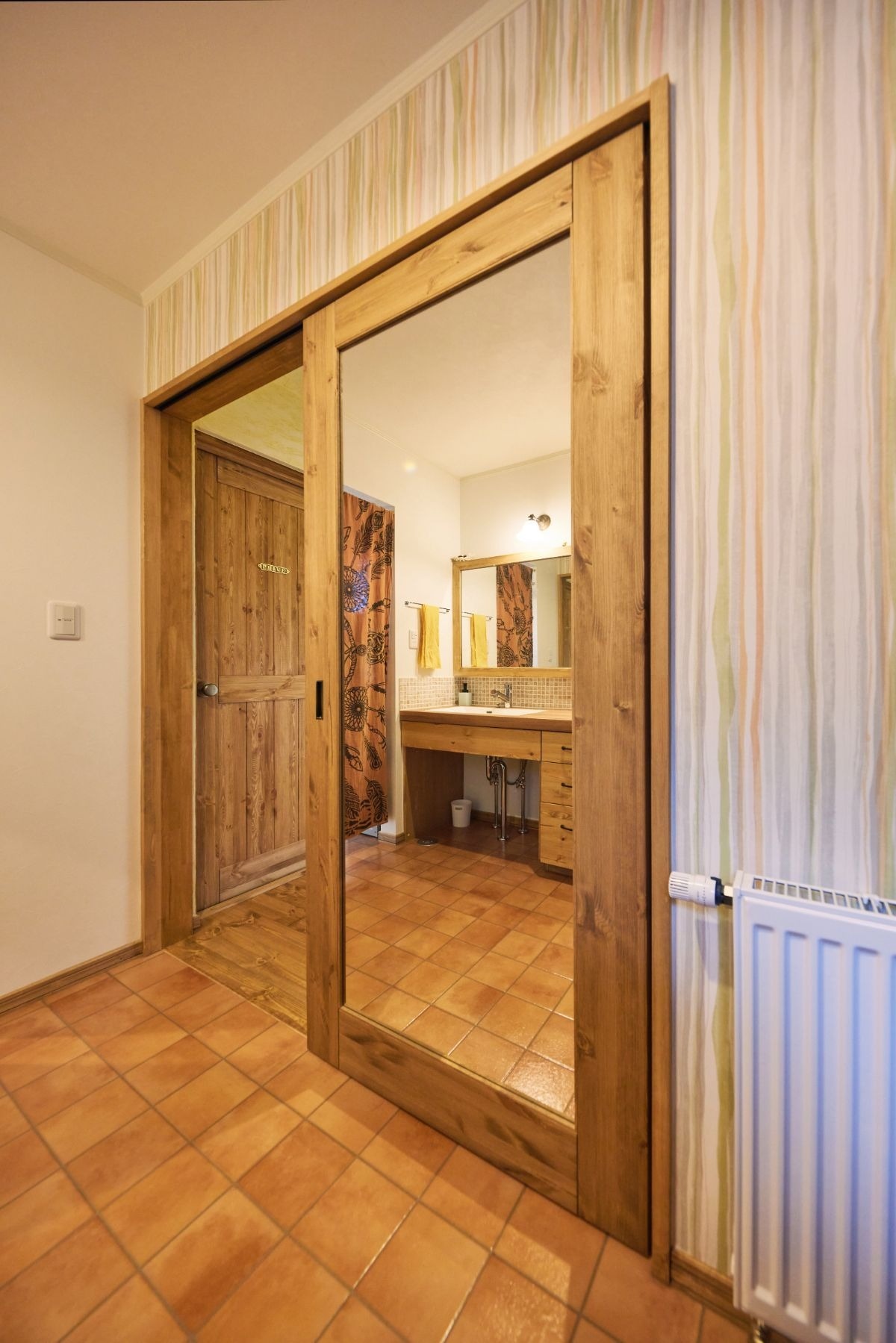 洗面所の扉には大きな姿見をつけました。