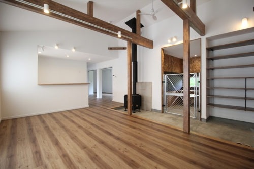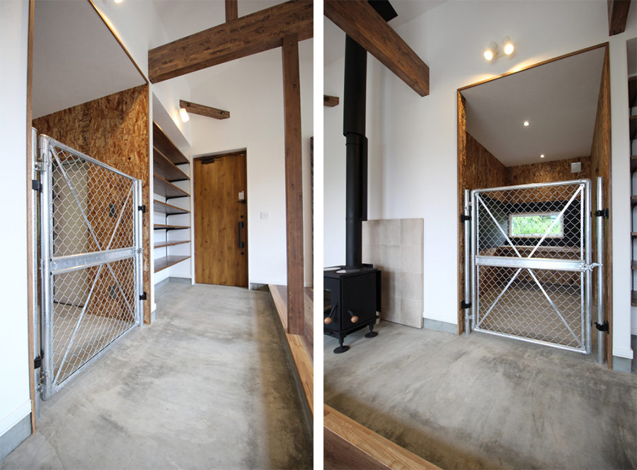 薪ストーブ、勾配天井、梁や柱の無垢材、そして無機質な土間から続く、ご主人の書斎(仕事部屋)兼ワンちゃんのお部屋は、入り口にフェンスを設置しました。例えばこうした男性らしいご要望にもお応えしています。